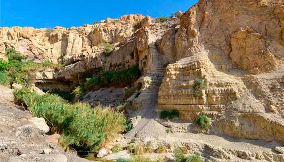 Die Oase En Gedi ist besonders mit einem Ereignis aus dem Alten Testament verbunden: König Saul verfolgt David, der sich mit 600 Soldaten zuerst in die Wüste Zif nahe der gleichnamigen Stadt zurückzieht und dann in Höhlen von En Gedi. David, der ein gottesfürchtiger Mann ist, hätte Saul leicht töten können, doch er schneidet ihm unbemerkt einen Zipfel seiner Kleidung zum Beweis ab, dass er ihn hätte auch hätte vernichten können.