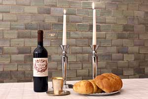 Gedeck zum Shabbatbeginn mit Shabbatkerzen, Challa, dem Kiddushbecher und kosherem Wein. (© Matthias Hinrichsen)